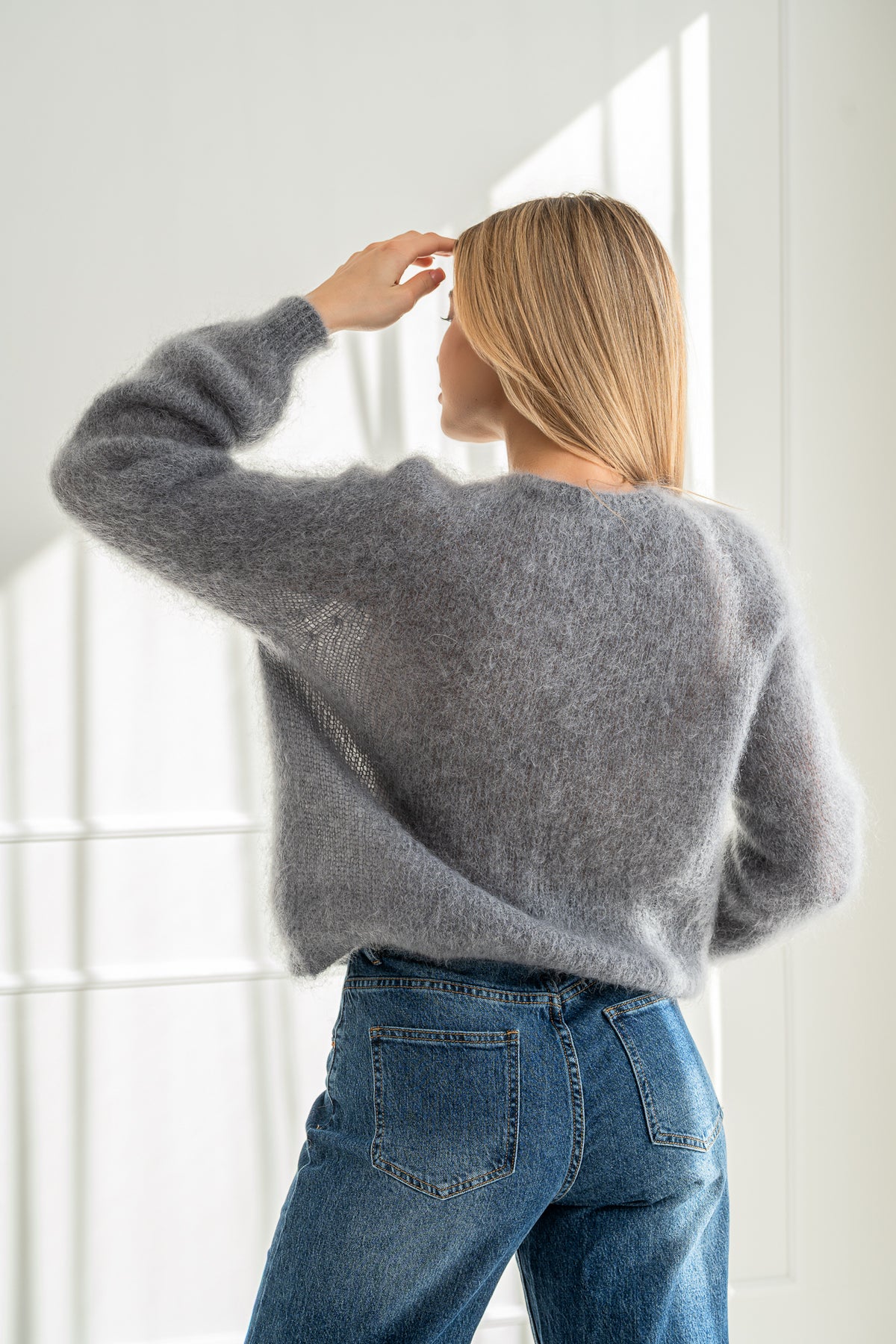 Moteriškas itališkas megztinis su moheros vilna. Apvali apykaklė, ilgos rankovės, nuleista pečių linija. Itin minkštas, lengvas ir šiltas megztinis taps tavo mylimiausiu.