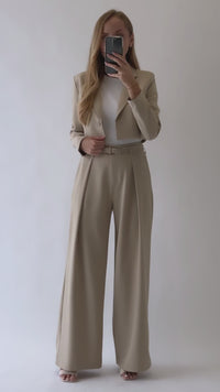 Moteriškos plačios klasikinės kelnės su diržu. Lengvas audinys, aukštas juosmuo, tiesios klešnės. Užsegamos saga ir metaliniu užtrauktuku.
