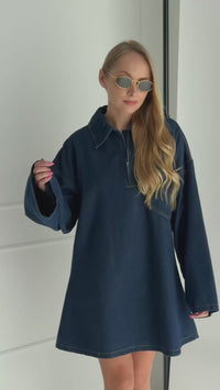 Moteriška vidutinio ilgio džinsinė suknelė, ilgomis rankovėmis. Laisvas ir neįpareigojantis suknelės modelis ir lengvas audinys užtikrins maksimalų komforto jausmą.