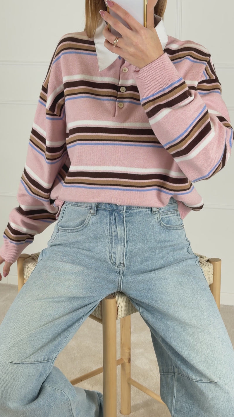 Moteriškas stilingas dryžuotas megztinis su polo apykakle. Ilgos rankovės, nuleista pečių linija.